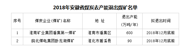 2018年安徽省煤炭去產(chǎn)能退出煤礦名單公示