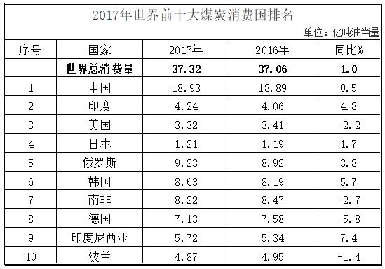 2017年,全球煤炭消費(fèi)量為37.3億噸油當(dāng)量,比上年上漲1.0%。其中,中國(guó)占世界煤炭總消費(fèi)量的46.4%,比上年下降4.2個(gè)百分點(diǎn);韓國(guó)超越南非成為全球第六大煤炭消費(fèi)國(guó)。消費(fèi)量排名前十的國(guó)家是中國(guó)、印度、美國(guó)、日本、俄羅斯、韓國(guó)、南非、印度尼西亞、德國(guó)和波蘭。