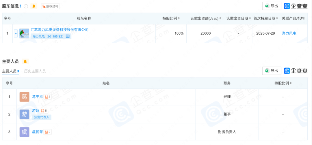近日,海力海上風(fēng)電裝備(溫州)有限公司成立,法定代表人為游超,注冊(cè)資本為20000萬(wàn)元。新公司經(jīng)營(yíng)范圍包含:新能源原動(dòng)設(shè)備制造;海上風(fēng)電相關(guān)裝備銷(xiāo)售;海洋工程裝備制造;海洋工程裝備銷(xiāo)售;海洋工程平臺(tái)裝備制造;海洋能系統(tǒng)與設(shè)備銷(xiāo)售;海洋能系統(tǒng)與設(shè)備制造;海洋工程關(guān)鍵配套系統(tǒng)開(kāi)發(fā);海上風(fēng)電相關(guān)系統(tǒng)研發(fā);風(fēng)電場(chǎng)相關(guān)系統(tǒng)研發(fā);風(fēng)電場(chǎng)相關(guān)裝備銷(xiāo)售等。企查查股權(quán)穿透顯示,該公司由江蘇海力風(fēng)電設(shè)備科技股份有限公司100%持股。