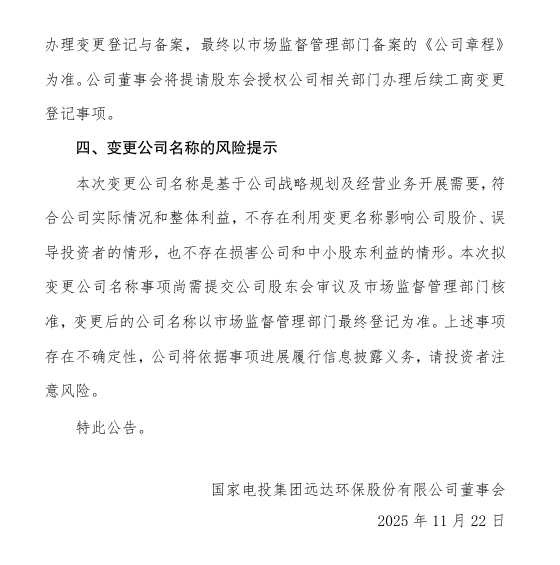 國家電投集團遠達環(huán)保股份有限公司擬更名