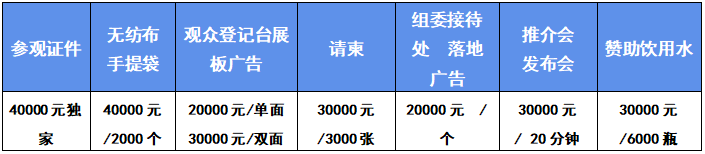 ●品牌展位:國內(nèi)企業(yè):(長×寬×高:6m×3m×4.5m)¥30,000 / 18㎡;國際企業(yè):¥,40,000/18㎡(含鋼制桁架搭建、噴繪制作、地毯、洽談桌椅及照明等)