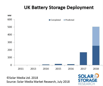 2018年,英國(guó)大規(guī)模電池儲(chǔ)能系統(tǒng)的裝機(jī)容量將超過450MW,僅今年上半年就完成了約250MW的儲(chǔ)能系統(tǒng)的部署。這都是由1MW以上的儲(chǔ)能項(xiàng)目組成的,其中包括已經(jīng)開始出現(xiàn)的用戶側(cè)更大的儲(chǔ)能項(xiàng)目。