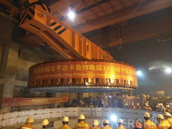 卡魯瑪水電站共設(shè)6臺套額定容量為額定功率為100MW(最大功率110MW)的發(fā)電機,其發(fā)電機轉(zhuǎn)子包括中心體、支架、磁軛、磁極和制動環(huán),整個轉(zhuǎn)子組裝在卡魯瑪?shù)叵露词野惭b間完成。轉(zhuǎn)子最大高度1.842米,最大直徑9.350米,包含轉(zhuǎn)子起吊工具重達(dá)350噸,其結(jié)構(gòu)具有足夠的強度和剛度,采用無風(fēng)扇結(jié)構(gòu)并具有結(jié)構(gòu)合理、緊湊及良好的電磁、通風(fēng)性能。