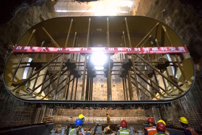 白鶴灘水電站工程右岸共布置有8臺(tái)單機(jī)容量百萬(wàn)千瓦的水輪發(fā)電機(jī)組,每臺(tái)水輪機(jī)尾水肘管分為13節(jié),單管節(jié)最大重量42.8噸,最小重量16.9噸。肘管進(jìn)水口截面為圓型,直徑9750毫米;出水口為高9165毫米、寬15559毫米的橢圓形截面。最先吊裝的9號(hào)機(jī)肘管(含內(nèi)支撐)安裝工程量為337.5噸。