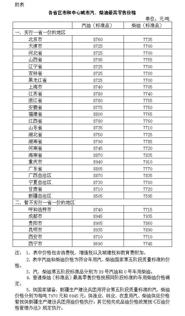 附:各省區(qū)市和中心城市汽、柴油最高零售價格