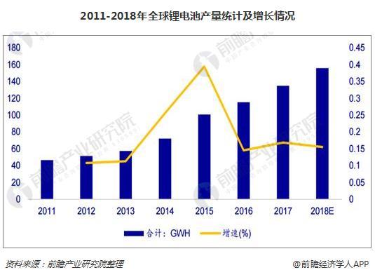 2011年以來,由于能源技術(shù)變革以及新興科技的帶動下,全球鋰離子電池產(chǎn)量進入飛速增長期,2012年到2015年增速均超過50%。2015年全球鋰電池產(chǎn)量100.75GWh,同比增長39.45%;2017年,鋰離子電池主要應(yīng)用市場增速放緩,增速只有16.85%,但受益于新能源汽車行業(yè)景氣帶動的動力電池繁榮,預(yù)計2018年全球鋰電池增速維穩(wěn),產(chǎn)量有望達到155.82GWH,市場規(guī)模將到達2313.26億元。