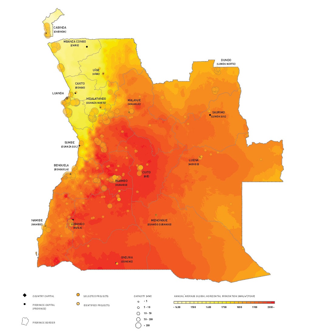 下圖顯示了安哥拉太陽能資源圖集以及確定具有安裝多個太陽能光伏項目GW的巨大潛力的各個地點。它還包括選擇用于安裝連接到主電網(wǎng)的78兆瓦的站點,包括中型和大型項目,這些都是達(dá)到既定的100兆瓦目標(biāo)所必需的。這些地點的選擇是因為它們的能源成本較低,主要位于該國的中部和南部。