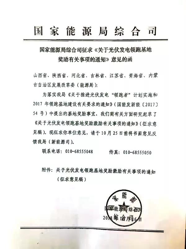 從國家能源局綜合司處獲悉,該局在日前印發(fā)了征求《關于光伏發(fā)電領跑基地獎勵有關事項的通知》意見的函,就國能發(fā)新能【2017】54號中提出的領跑者基地獎勵事宜征求相關發(fā)改委(能源局)的意見。