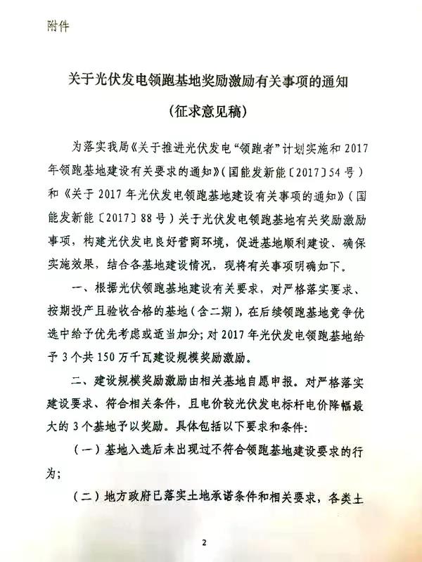 通知指出,根據(jù)光伏領跑基地建設有關要求,對嚴格落實要求、按期投產(chǎn)且驗收合格的基地(含二期),在后續(xù)領跑基地競爭優(yōu)選中給予優(yōu)先考慮或適當加分;對2017年光伏發(fā)電領跑基地給予3個150萬千瓦建設規(guī)模獎勵激勵。