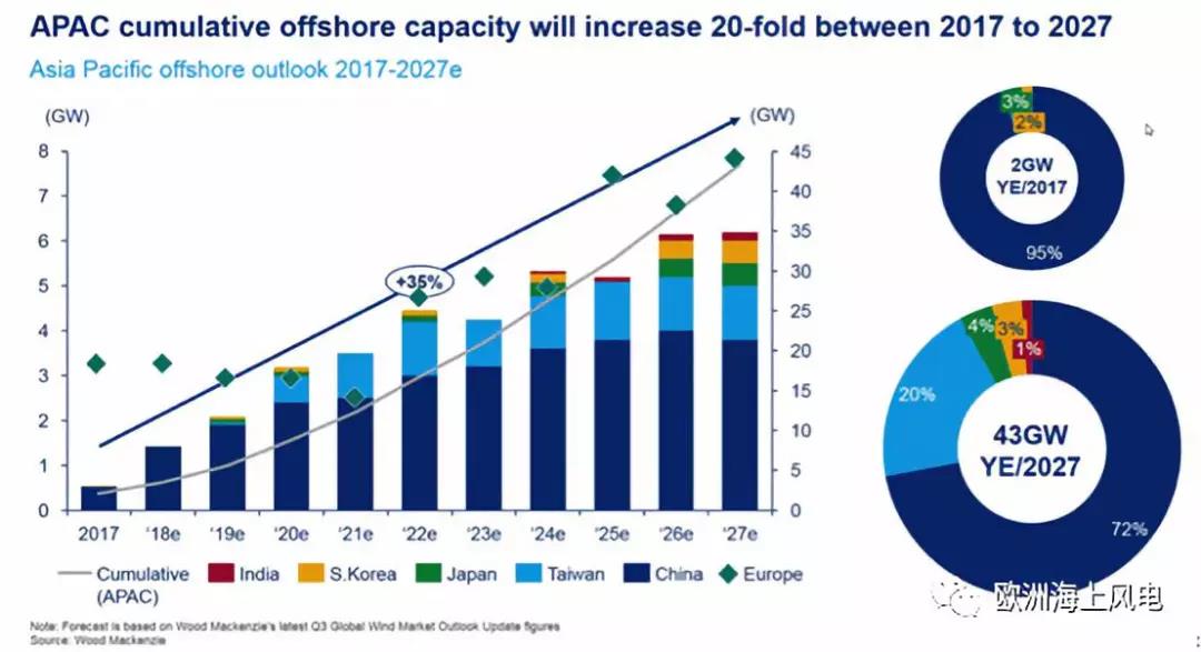 1、到2027年亞太地區(qū)海上風電裝機容量較2017年增長20倍,裝機容量從2GW增長到43GW。平均年新增裝機超過4GW,年度復(fù)合增長率35%,發(fā)展前景可觀。