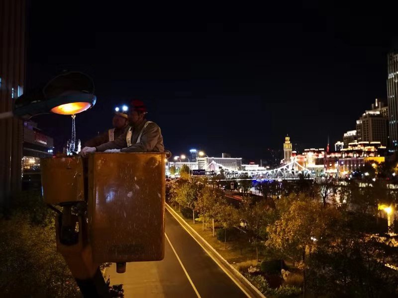 天津電力路燈公司員工在檢修路燈,智慧電網(wǎng)大大減少了路燈故障率