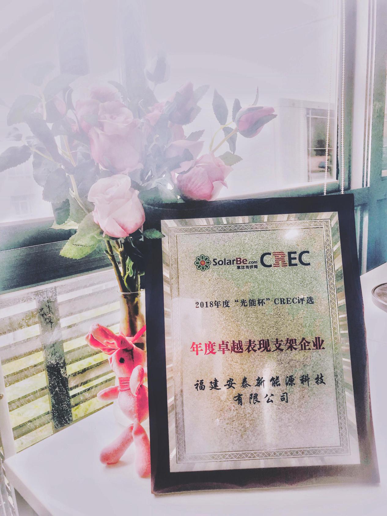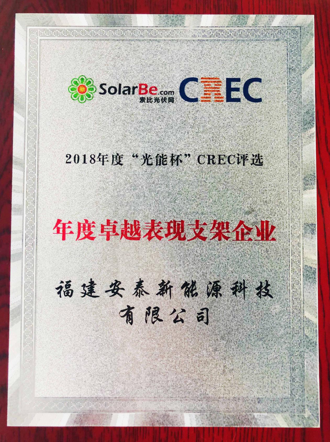 2018年“光能杯”CREC光伏行業(yè)評選頒獎盛典于10月31日晚在無錫正式拉開帷幕,作為國內(nèi)領(lǐng)先的光伏支架企業(yè),憑借優(yōu)秀的市場口碑以及項目實績,福建安泰新能源科技有限公司成功斬獲“年度卓越表現(xiàn)支架企業(yè)”大獎。