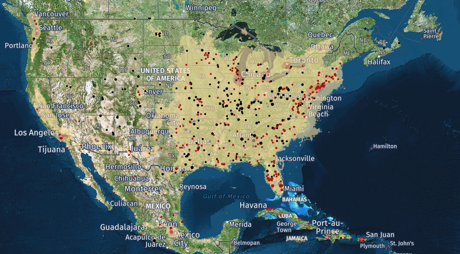 美國(guó)NO2污染。彩色圓點(diǎn)代表發(fā)電廠。彩色的云顯示該地區(qū)的二氧化氮水平。云越深或越粉,濃度越高。