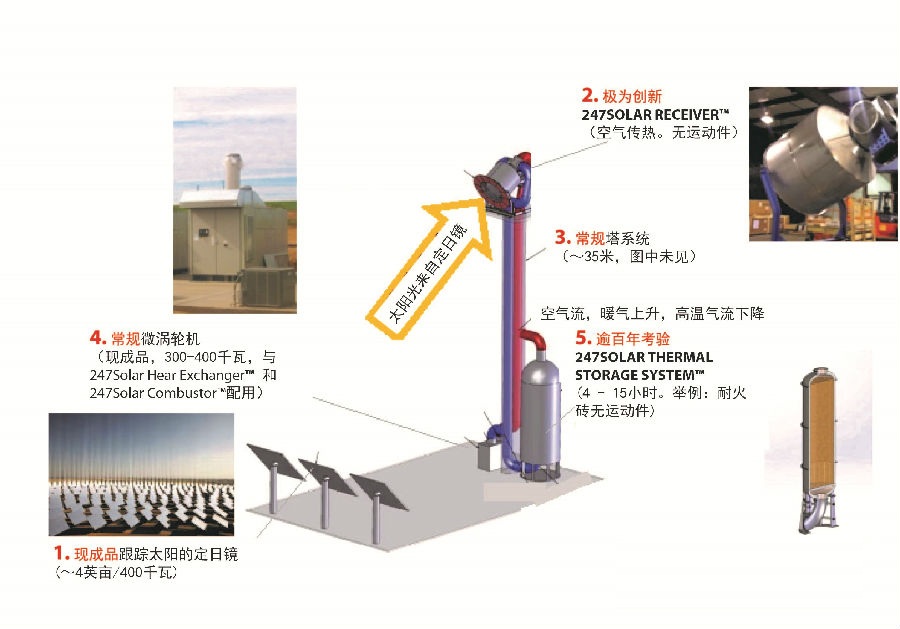 在系統(tǒng)設(shè)計(jì)方面,太陽(yáng)能加熱高溫空氣,而非水和蒸汽,作為驅(qū)動(dòng)介質(zhì)推動(dòng)燃?xì)廨啓C(jī)。在熱轉(zhuǎn)換方面的重大創(chuàng)新,幫助247打破了傳統(tǒng)光熱系統(tǒng)的復(fù)雜性和成本的障礙。此外,在電站設(shè)計(jì)、建設(shè)和運(yùn)營(yíng)也實(shí)現(xiàn)簡(jiǎn)化,進(jìn)一步降低了電站成本,提升了電站開(kāi)發(fā)速度。