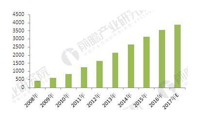 圖表1:2008-2017年中國節(jié)能服務(wù)產(chǎn)業(yè)產(chǎn)值規(guī)模變化情況(單位:億元)