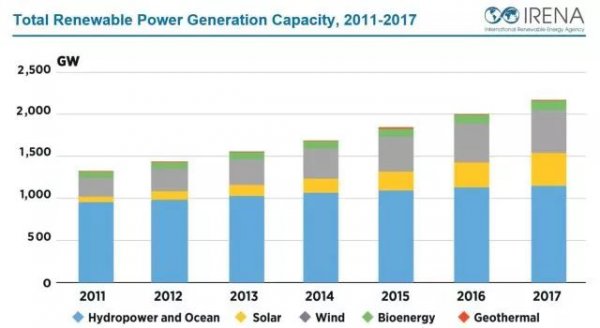 國際可再生能源機構(gòu)(IRENA)發(fā)布的新數(shù)據(jù)顯示,2017年全球可再生能源發(fā)電容量增加167GW,達到2179GW。 這意味著一年約增長8.3%。