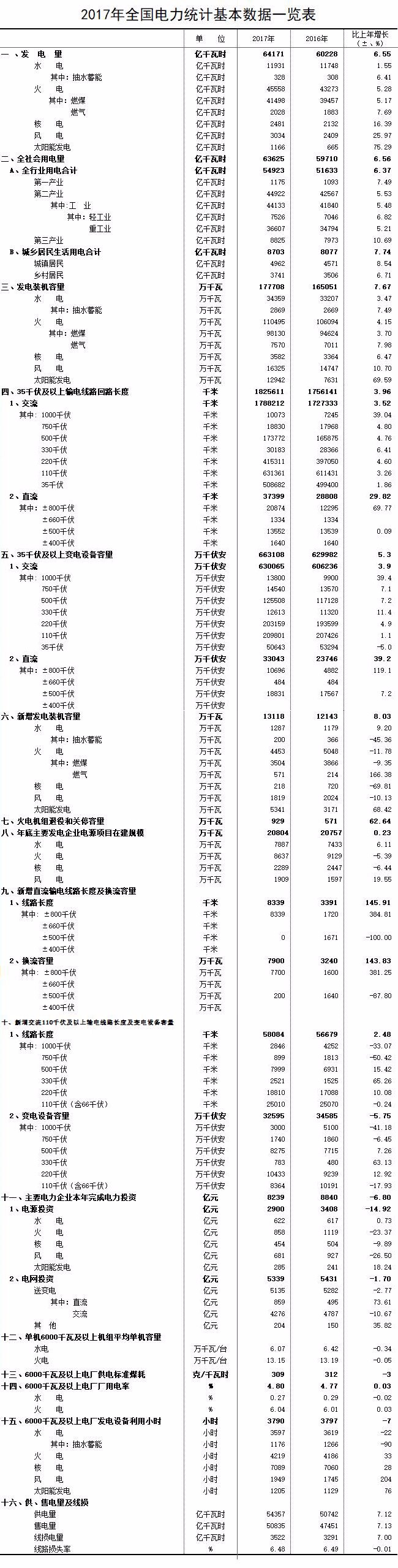 日前中電聯(lián)行業(yè)發(fā)展與環(huán)境資源部發(fā)布了《2017年電力統(tǒng)計基本數(shù)據(jù)一覽表》,數(shù)據(jù)顯示2017年全社會用電量為63625億千瓦時,比2016年增長6.56%;主要電力企業(yè)本年完成電力投資共計8239億元,比2016年減少6.8億元。詳情如下: