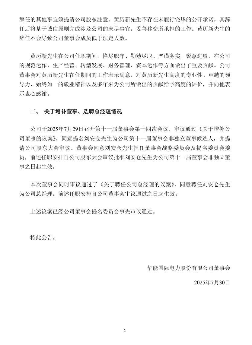 7月30日,華能國際發(fā)布公告稱,公司董事、總經(jīng)理黃歷新先生因工作調(diào)整,于近日依據(jù)有關(guān)規(guī)定向公司董事會提交了書面辭職報(bào)告,申請辭去公司董事、總經(jīng)理以及董事會戰(zhàn)略委員會和提名委員會委員職務(wù)。