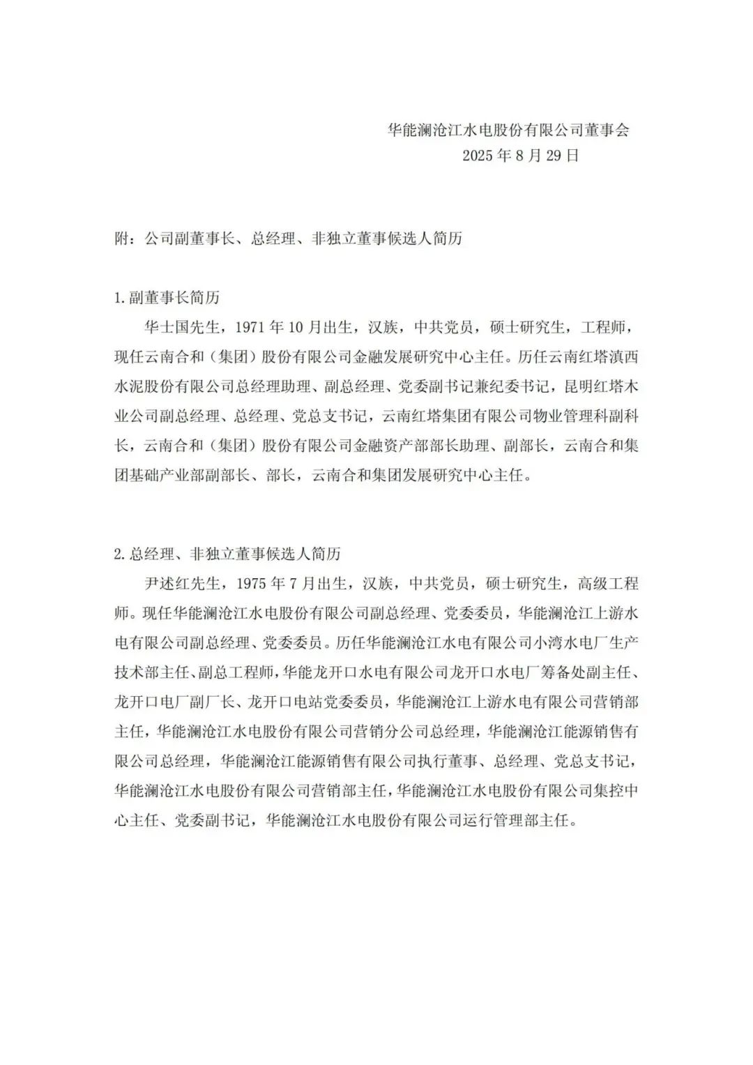 華能水電副董事長、總經(jīng)理調(diào)整