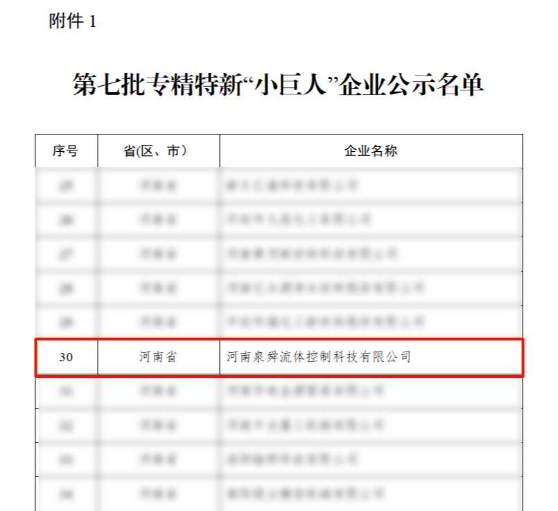 近日,工業(yè)和信息化部正式公布2025年河南省第七批專精特新"小巨人"企業(yè)認(rèn)定名單,河南泉舜流體控制科技有限公司憑借在閥門領(lǐng)域深厚的技術(shù)積累和卓越的創(chuàng)新能力,成功入選國家級專精特新"小巨人"企業(yè)行列。