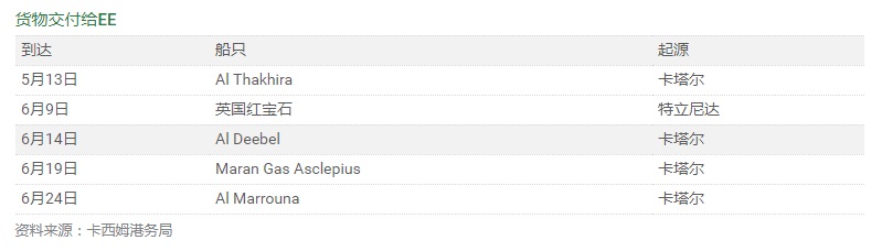 交付給EE終端的五種貨物中有四種是從卡塔爾運來的,另一種是從特立尼達和多巴哥運來的,發(fā)貨人被列為Gas Natural。