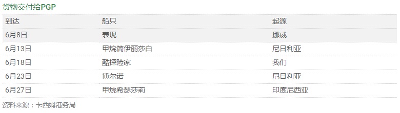巴基斯坦于5月在旁遮普地區(qū)的Haveli Bahadur Shah和Bhikki完成了兩座燃氣發(fā)電廠的投產(chǎn)。這產(chǎn)生了對六種液化天然氣貨物的充足需求,這些貨物已交付給PGP終端。位于旁遮普邦的Balloki的第三座發(fā)電廠預計將在未來幾個月內(nèi)啟動。這將為電網(wǎng)增加約3.6 GW的新容量,并有助于減少停電的可能性。