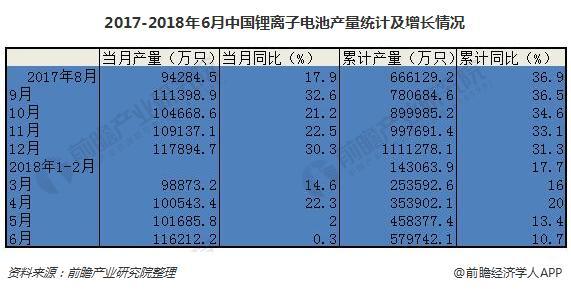 據(jù)前瞻產(chǎn)業(yè)研究院發(fā)布的《鋰電池行業(yè)市場需求預(yù)測與投資戰(zhàn)略規(guī)劃分析報告》統(tǒng)計數(shù)據(jù)顯示,2018年6月,中國鋰離子電池產(chǎn)量為116212.2萬只,同比微增0.3%。2018年1-6月,全國鋰離子電池累計產(chǎn)量達579742.1萬只,同比增長10.7%。