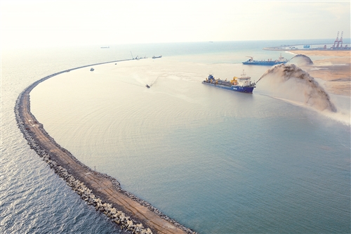 科倫坡港口城項(xiàng)目是中國(guó)與斯里蘭卡在“一帶一路”建設(shè)中的重點(diǎn)合作項(xiàng)目,由斯里蘭卡政府和中國(guó)港灣科倫坡港口城有限責(zé)任公司聯(lián)合開(kāi)發(fā),于2014年9月動(dòng)工,整體開(kāi)發(fā)時(shí)間約25年。圖為吹沙船在科倫坡港口城項(xiàng)目上進(jìn)行疏浚吹填作業(yè)。(圖片來(lái)源:新華社)